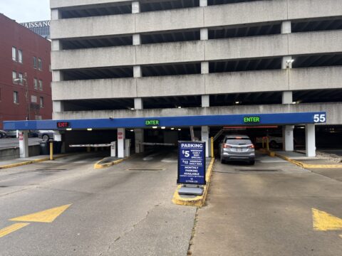 The garage’s main entrance is located at 55 E .Long St. It has two entrances and two exits.